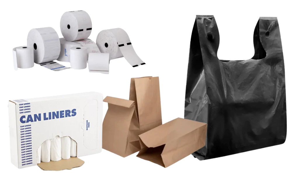 T-shirt Bags, POS Thermal Rolls, Kraft Paper Bags, Can Liners